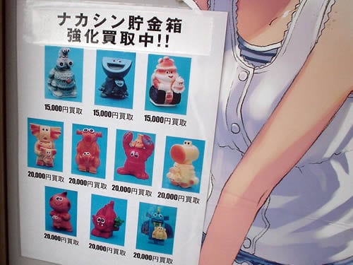 まんだらけ秋葉原店では「ナカシン貯金箱」の買取価格表が掲示されているが、ナカシン貯金箱でググッてもなにも見つからない。まんだらけでは強化買取するくらいなので、ネットに何か情報があるかと思っていたがナゾだ。
