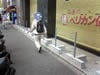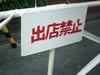 「幸せは心の広さに比例する」の張り紙がある神田寺ビル周辺は露店が出店ができないように柵を設置