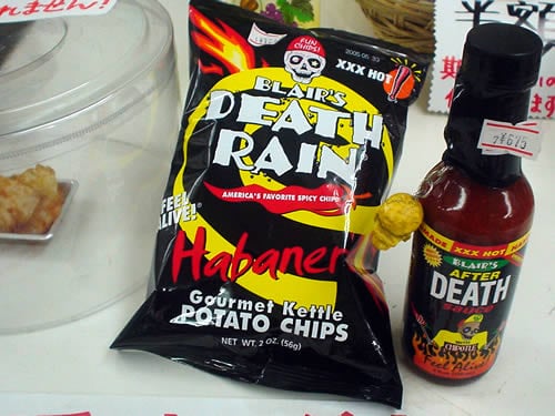 先月アキバBlogでお伝えしたLAOXザ・コンの斜め向かい側にある輸入食品、菓子の店FOODS SHOP WATABEのデスレイン ハバネロチップとアフターデスソースの有料試食でどちらも食べたことがなかったのでを先日試してみた。カウンターのPOPには「お水等はお出しできません。あらかじめご了承くださいませ」と書いてあったのを「大げさだな~」と思ったのは間違いだった。