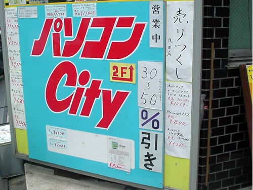 以前ユーザーズサイドのビル地下にあったパソコンCityは、5月に牛丼サンボの上に移転したが、閉店することが決まったようで、店頭の看板にあった「売りつくし」の横に小さく「後閉店」と書かれていて、30~50%引きでのセールを行っているとなっていた。